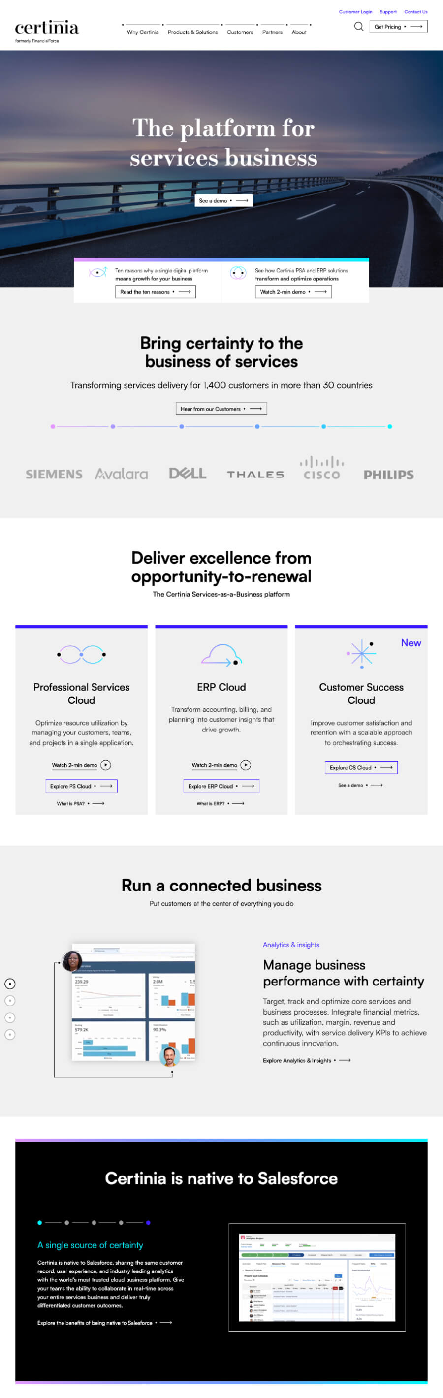 Software platform Certinia connects all digital aspects of services operations, providing end-to-end integration between estimation, accounting, customer relationship management, and more. Having recently completed a rebranding project, Certinia (formerly FinancialForce) needed a new website with an excellent user experience to match their seamless, Services-as-a-Business platform.